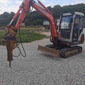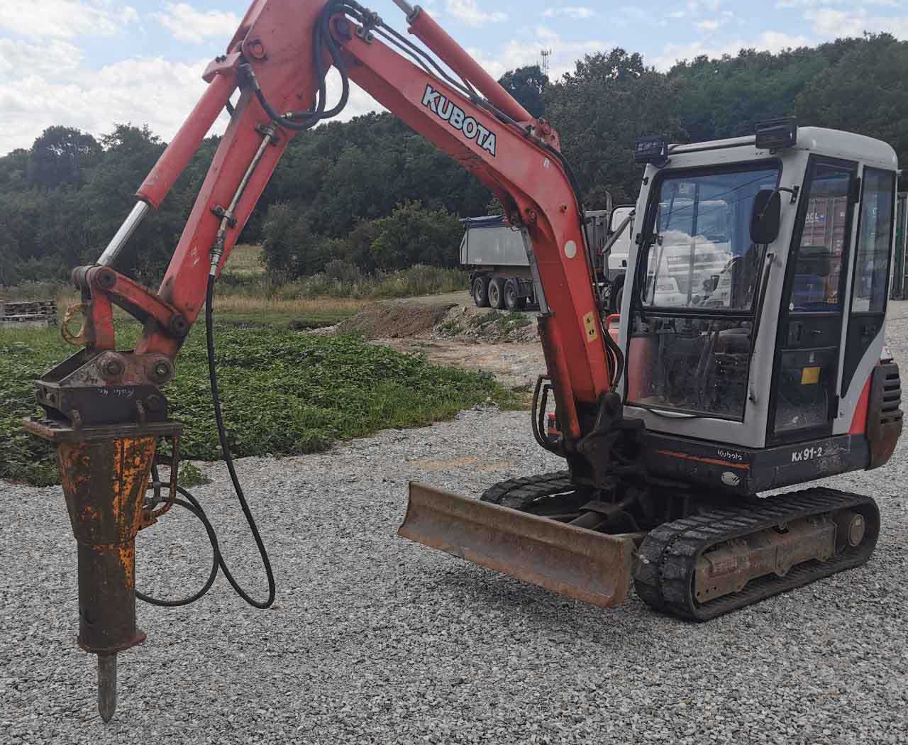 Kubota típusú gumi lánctalpas forgókotró, betontőrő adapterrel.